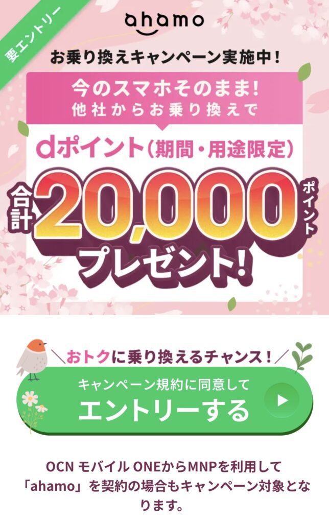 現在、他社(au、ソフトバンク、楽天モバイル、格安SIM各社)から乗り換える際、SIMのみの契約で最大20,000dポイントが還元されるキャンペーンが実施されています。